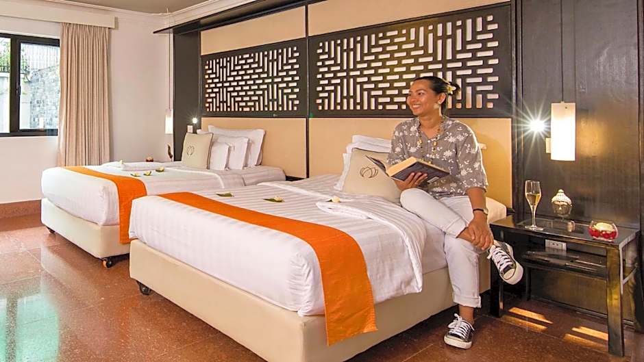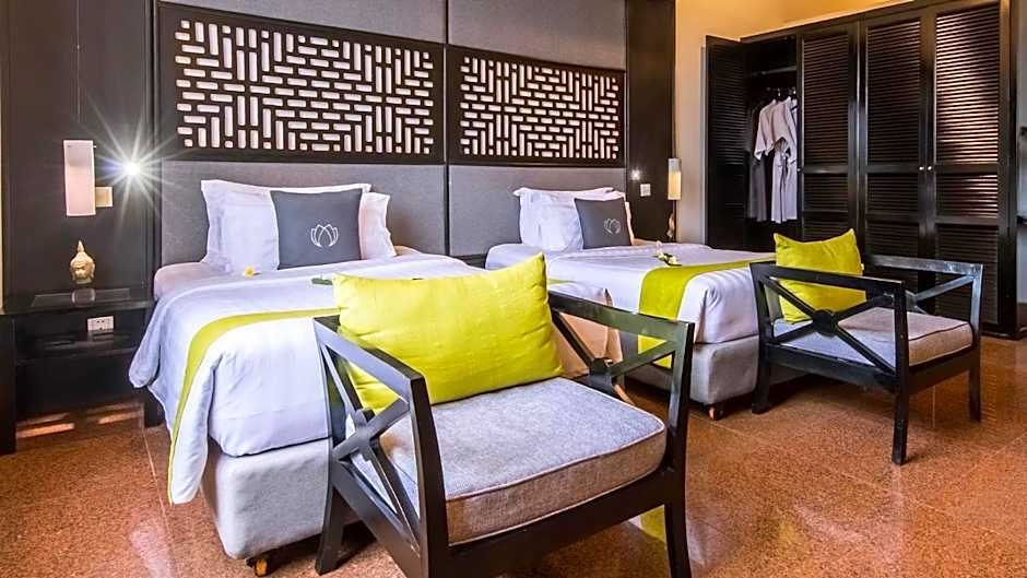 Contemporary-styled and furnished with dark wood furniture, this air-conditioned room opens up to views of the swimming pool. The two single beds are equipped with a box-spring mattress and memory foam pillows. It is fitted with a flat-screen TV. Marble bathroom comes with double sinks and shower.